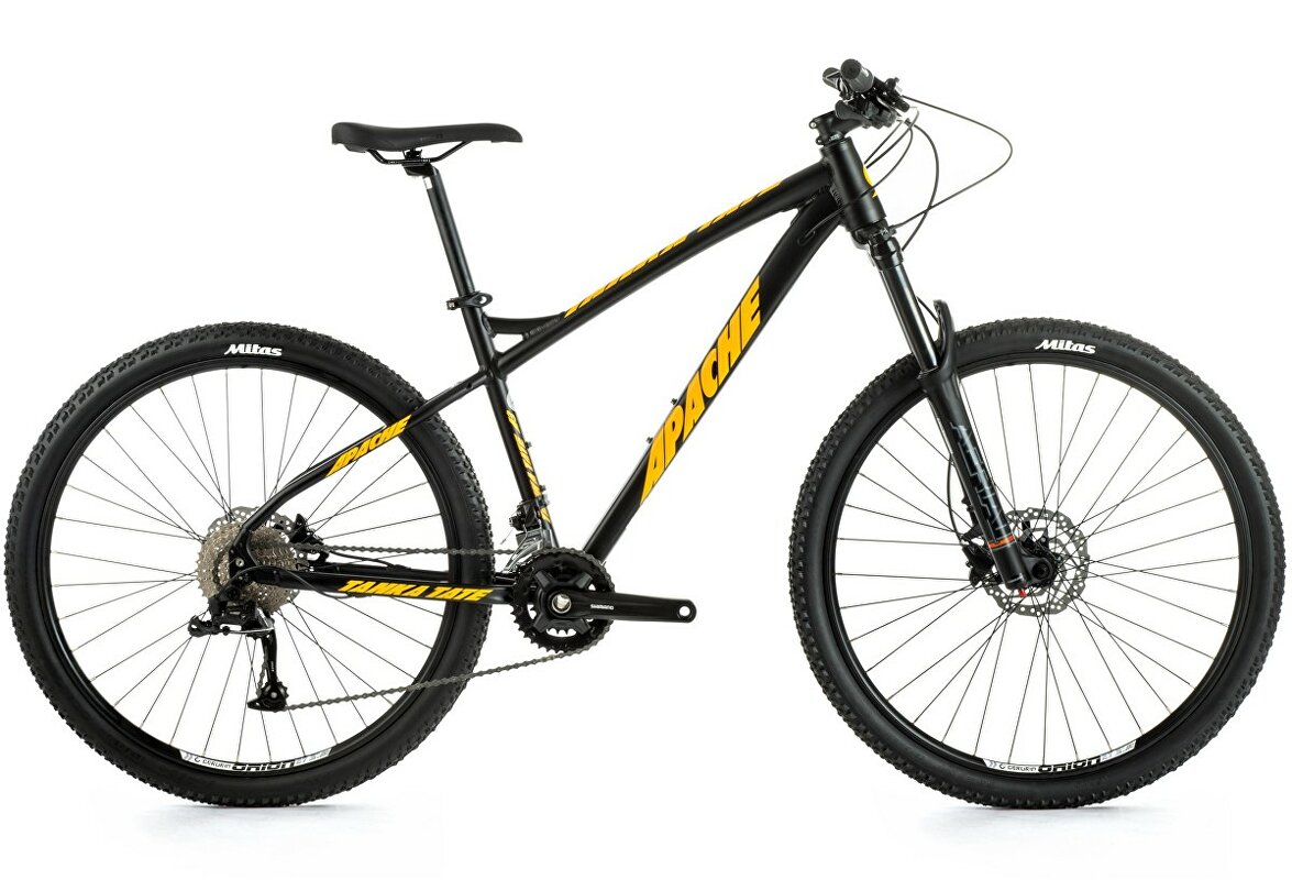 Apache Tanka Tate A3 je horské kolo s hlinikovým rámem, koly o průměru 27,5 palce, odpruženou vzduchovou vidlicí a pohonem 2x9.