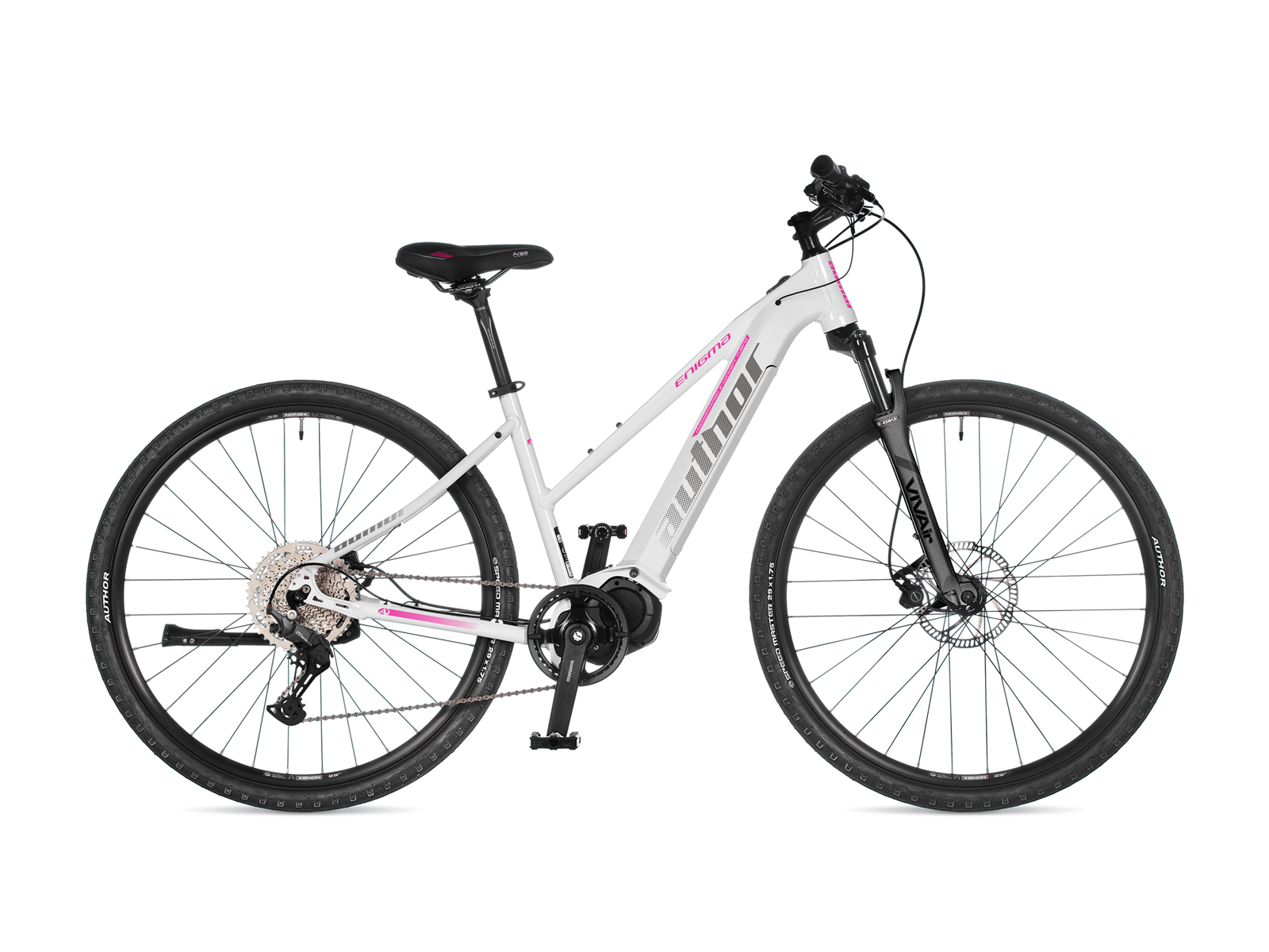 Velmi populární dámské krosové elektrokolo kategorie E-CROSS 29 vyšší třídy. Tato kategorie vychází z požadavku doby o větší komfort při běžné jízdě i mimo silnici a popularitu 29" kol. Všechny modely E-CROSS 29 mají zdvih odpružených vidlic 80 mm. Uživatelce nabídne optimální poměr mezi sportovním a komfortním projevem. Za jeho sportovními ambicemi stojí především nízká hmotnost a citlivý projev elektromotoru Shimano STEPS. Díky torznímu snímači v klikách dokáže jemně dávkovat svoji pomoc a nekazí tak pocit jízdy, který je velmi podobný jako na běžném kole. Pohodlí zde představuje zejména snížený rám s nízkým nástupem, který je doplněn vzduchovou odpruženou vidlicí RST. Ke skvělému pocitu z jízdy přispívá i velmi měkké gelové sedlo a ergonomické gripy. Díky nízkému těžišti, lehkému a přesnému řazení nového Shimano Cues s rozsahem kazety 11–48 zubů a citlivým brzdám Tektro se Enigma skvěle ovládá a poskytuje své jezdkyni unikátní jízdní zážitek. Model je určen zejména sportovněji založeným ženám a dívkám, které byly či jsou zvyklé jezdit na kole. Není to motorka, která by odvedla všechnu práci za jezdkyni, ale chytrý citlivý stroj, který svoji dopomoc poskytne právě ve chvíli, kdy je jí potřeba. Author Enigma Vám tak umožní zvládnout kopcovitější nebo delší trasu aniž byste si sáhli na dno fyzických sil. Můžete si tak užívat cyklistiku bez stresu že někoho zdržujete, bez obav z toho, že Vám dojdou síly. Zmizí strašák dlouhých stoupání a nepříjemného protivětru, zůstanou pouze příjemné pocity a čistá radost ze zdravého pohybu. Enigma je jednou provždy vyřešená hádanka, zda je pro Vás vhodné elektrokolo.