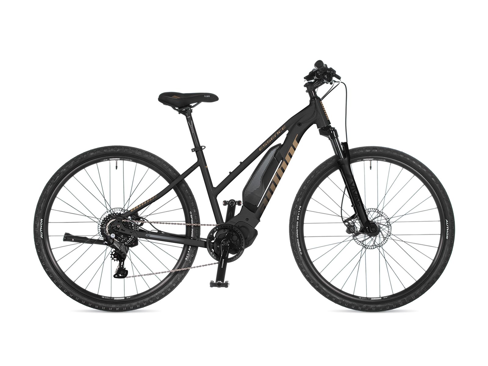 Základní model dámského sportovního krosového elektrokola kategorie E-CROSS 29. Tato kategorie vychází z požadavku doby o větší komfort při běžné jízdě i mimo silnici a popularitu 29" kol. Všechny modely E-CROSS 29 mají zdvih odpružených vidlic 80 mm. Může se pochlubit výborným poměrem cena / výkon. Author Essence nabídne všechny výhody špičkového elektropohonu Shimano STEPS, jehož akumulátor je zapuštěn do spodní rámové trubky. Snížený rám s pohodlným nástupem přináší vynikající komfort a skvělou ovladatelnost. Pro subtilnější ženy je také důležité, že disponuje velice příznivou hmotností díky 2× zeslabovaným duralovým trubkám a lehké vzduchové vidlici RST. O převody rychlostí se stará nová sada Shimano Cues s 9 rychlostmi s rozsahem kazety 11-41 zubů. Standardem jsou hydraulické kotoučové brzdy Tektro. Zbytek osazení tvoří spolehlivé komponenty Author. Kolo je určeno pro sportovně rekreační použití na silnici i zpevněných lesních a polních cestách. K tomu účelu je možné osadit ho blatníky, nosičem a rozličnými brašnami. Velice oblíbené a univerzální elektrokolo, které za svoji oblibu vděčí nejen příznivé ceně.