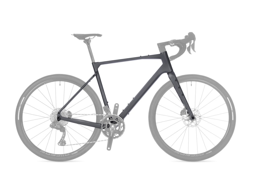 Karbon Toray T700 UD monocoque rám, 1,5“ hlavová trubka, vše vedené vnitřkem rámu od hlavové složení, 12×142 mm zadní stavba, střed. spojka standardu T47, sedlová trubka vrtaná pro sedlovku 27,2 mm, navářka na přesmykač typu „braze on“, podsedlová objímka = rozpěrka v sedlové trubce, UDH koncovka rámu, 9 závit. bodů na rámu, karbon Toray T700 monocoque vidlice včetně rozpěrky do sloupku vidlice, 12×100 mm patky, zužovaný sloupek vidlice 1,5“ tap., hlavové složení FSA No. 55R 1,5" / ACR / STD včetně 30mm podložek, 6 závit. bodů na vidlici, barva šedá matná.