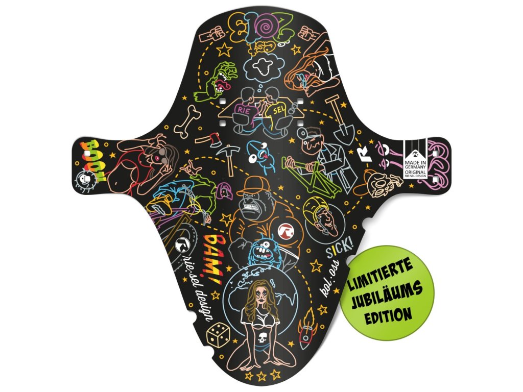Jednoduchý a funkční blatníček na vidlici a zadní stavbu v cool designu Rie:sel. Větší bráška od Schlam:PE - delší o "nos" a širší. Upevnění pomocí stahovacích pásek, které jsou součástí balení. Odolný proti poškrábání.