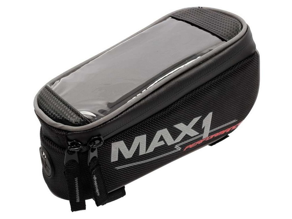 Kompaktní brašna MAX1 na rámovou trubku s kapsou uzpůsobenou pro mobilní telefon.