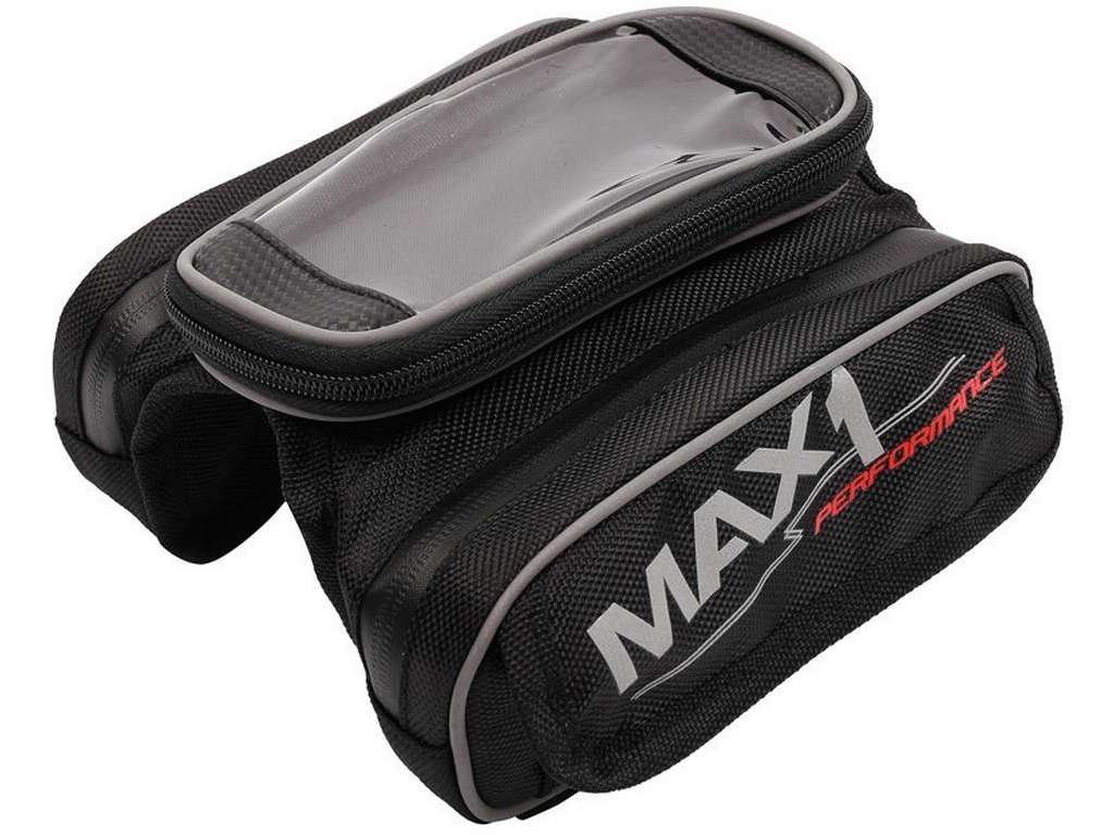 Kompaktní dvojitá brašna MAX1 na rámovou trubku s odnímatelnou kapsou uzpůsobenou pro mobilní telefon.