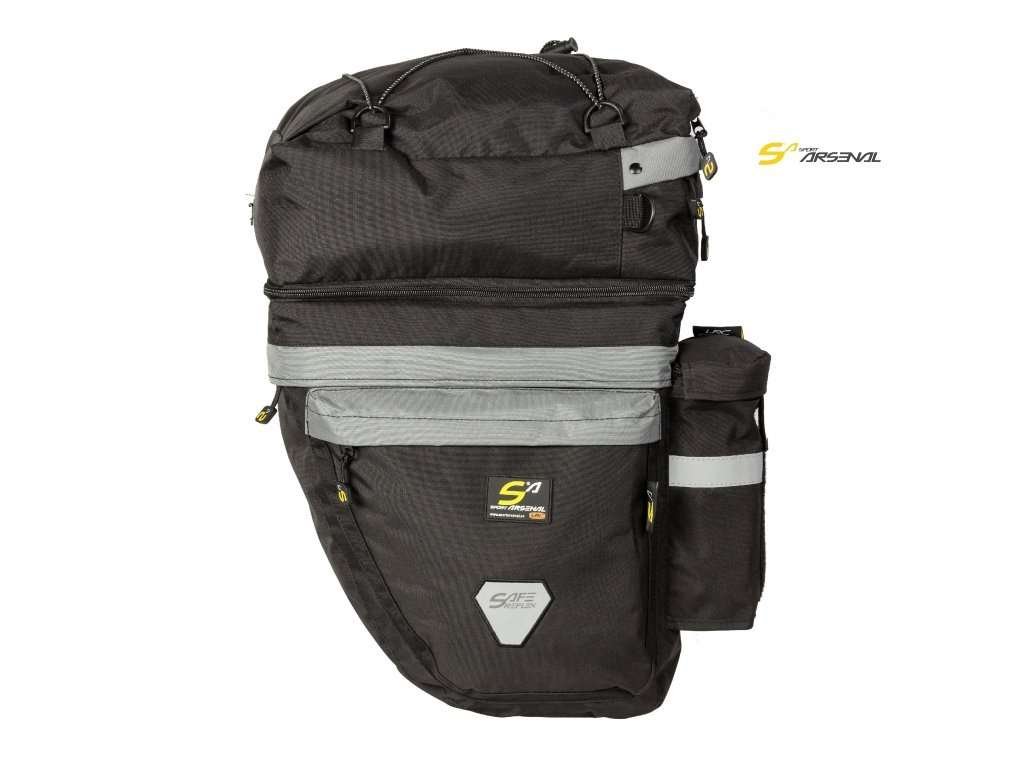 Velká a praktická trojbrašna na zadní nosič s odnímatelnou horní spacákovou brašnou je ideální pro vaše výlety! Brašna se k nosiči přichycuje pomocí gumicuku s háčkem. Tři hlavní kapsy i menší boční kapsičky jsou uzavíratelné zipem, dvě zadní otevřené kapsy jsou ideální pro převoz láhví na vodu (max. 1,5l). Horní spacákovou brašnu po odepnutí můžete využít jako brašnu přes rameno. Na víku spacákové brašny je praktická menší kapsa na drobnosti (mobil, klíče, peníze).
