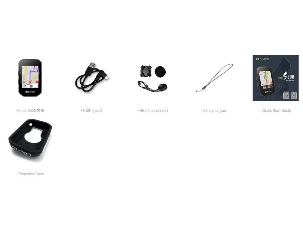 Obsah balení: Ride S500, návod, USB-C, BIKE MOUNT - držák pro Rider, SPORT MOUNT - držák pro Rider, bezpečností poutko