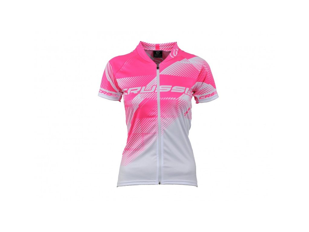 Dámský cyklistický dres s krátkým rukávem. Zvolený materiál se vyznačuje jednostranným pružením, tzn. do šířky je elastický a do délky drží tvar.