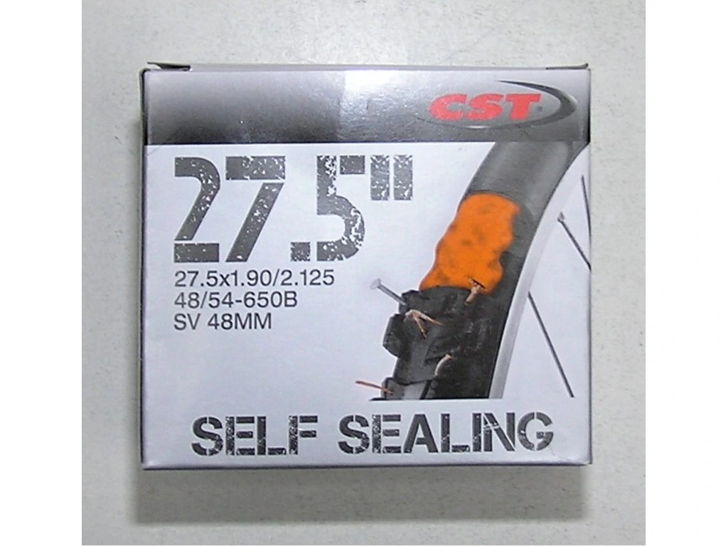 MTB duše CST 27,5", naplněná tmelem, který zacelý průraz po defektu, AV auto ventilek pogumovaný 48 mm