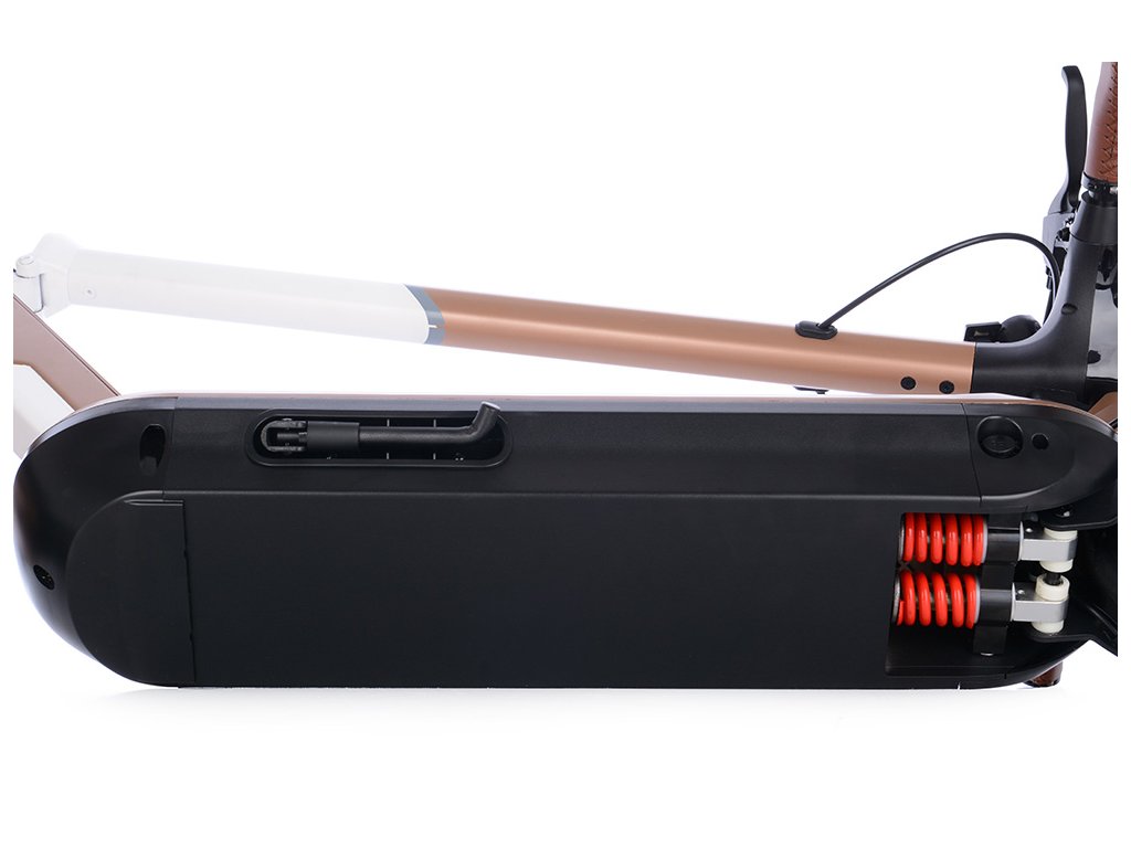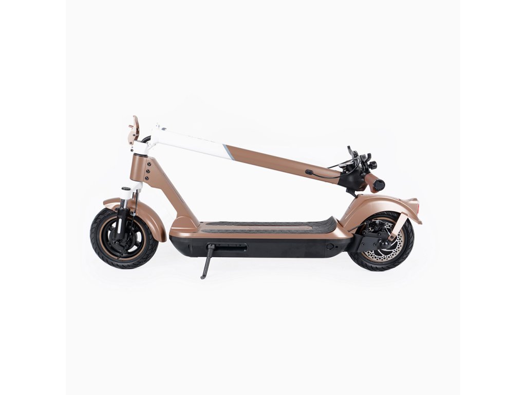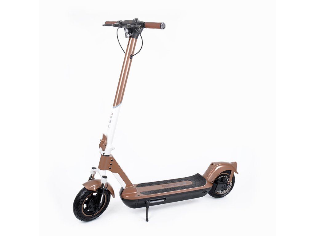Bezstarostnou jízdu zajišťují 10x2,5“ bezdušové pneumatiky, které nikdy nepropíchnete a překonávání překážek je snadnější díky jejich velkému průměru. Stabilitě na vozovce pomáhá i větší šířka pneumatiky. Přední i zadní vidlice jsou odpružené pro pohodlnou jízdu i po nerovném povrchu. Zadní blatník je vyztužen pro eliminaci únavového zlomu a nepříjemného zvuku při přejíždění nerovností.