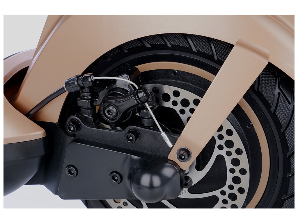 Tato e-koloběžka kombinuje 3 způsoby brzdění: elektronický, bubnový a kotoučový. V předním kole je umístěna bubnová brzda, jejíž brzdný účinek je snadno nastavitelný pomocí matice bez nutnosti použít nářadí. O brzdění zadního kola se stará kotoučová brzda s kvalitními třmeny v kombinaci s elektronickou brzdou motoru.