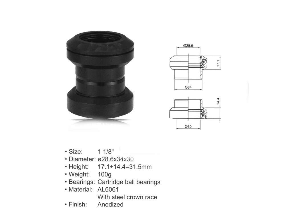 * 1 1/8"; d. 28.6x34x30; H:17,1+14.4=31,5mm, * Materiál: AL6061 / ocel (kroužek na korunku vidlice)* kuličková ložiska