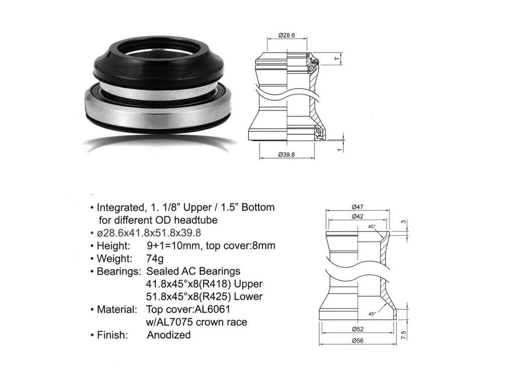 * 1 1/8" horní; 1,5" spodní; d. 28.6x41.8x51.8x39.8; H:9+1=10mm, vrchní krytka 8mm;* Materiál: AL6061 / AL7075 * kuličková ložiska s těsněním