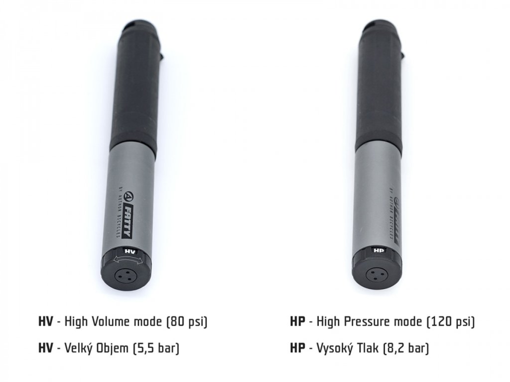 - Dva režimy huštění: Velký Objem (HV) – pro rychlé nahuštění s max. tlakem 80 PSI / Vysoký tlak (HP) – pro dohuštění s max. tlakem 120 PSI. Otočením koncovky rukojeti přepnete na požadovaný režim.