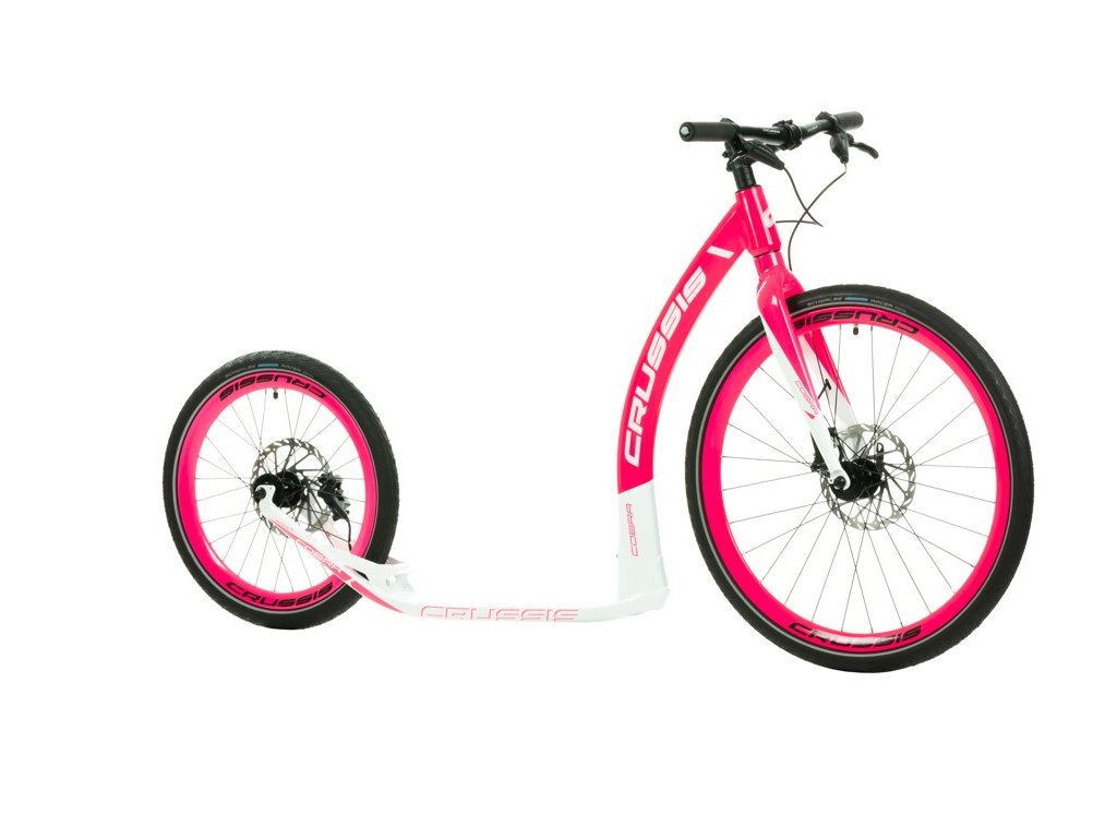 Hliníková koloběžka COBRA Sport od CRUSSIS na špičových kotoučových hydraulických brzdách SRAM s průměrem kol 26“×20“ a hmotností 8,650 kg. Koloběžka je ideální pro akční jezdce do kopcovitějšího terénu, má podstatně lepší brzdný účinek.