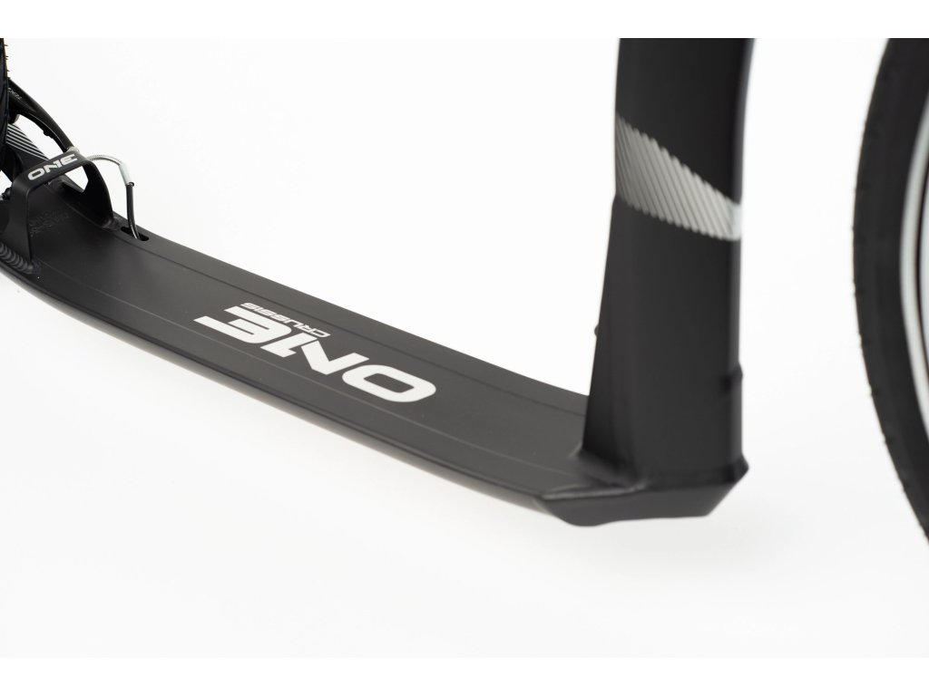 Unikátně řešené stupátko je nejen svébytný designový prvek, ale především konstrukční řešení eliminující u koloběžek typické únavové lomy v místech obvyklého navaření zadní vidlice ke stupátku.