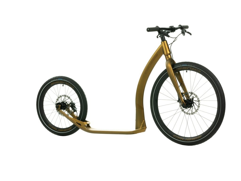 Hliníková koloběžka COBRA Sport od CRUSSIS na špičových kotoučových hydraulických brzdách SRAM s průměrem kol 26“×20“ a hmotností 8,650 kg. Koloběžka je ideální pro akční jezdce do kopcovitějšího terénu, má podstatně lepší brzdný účinek.