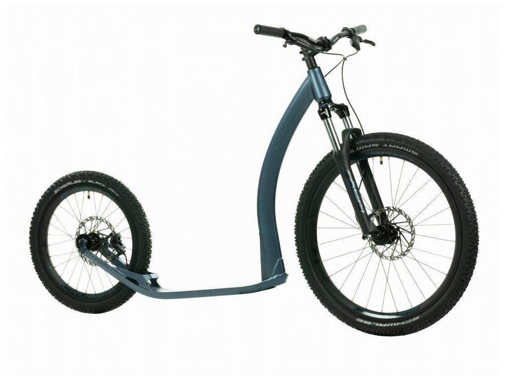 Hliníková koloběžka do terénu CROSS 6.2 na špičkových kotoučových hydraulických brzdách SRAM s průměrem kol 26"×20“, hmotností 10,870 kg, odpruženou vidlici SUNTOUR a na MTB pláštích SCHWALBE. Koloběžka je ideální do náročnějšího terénu na sjezdy či akční jízdu se psem.