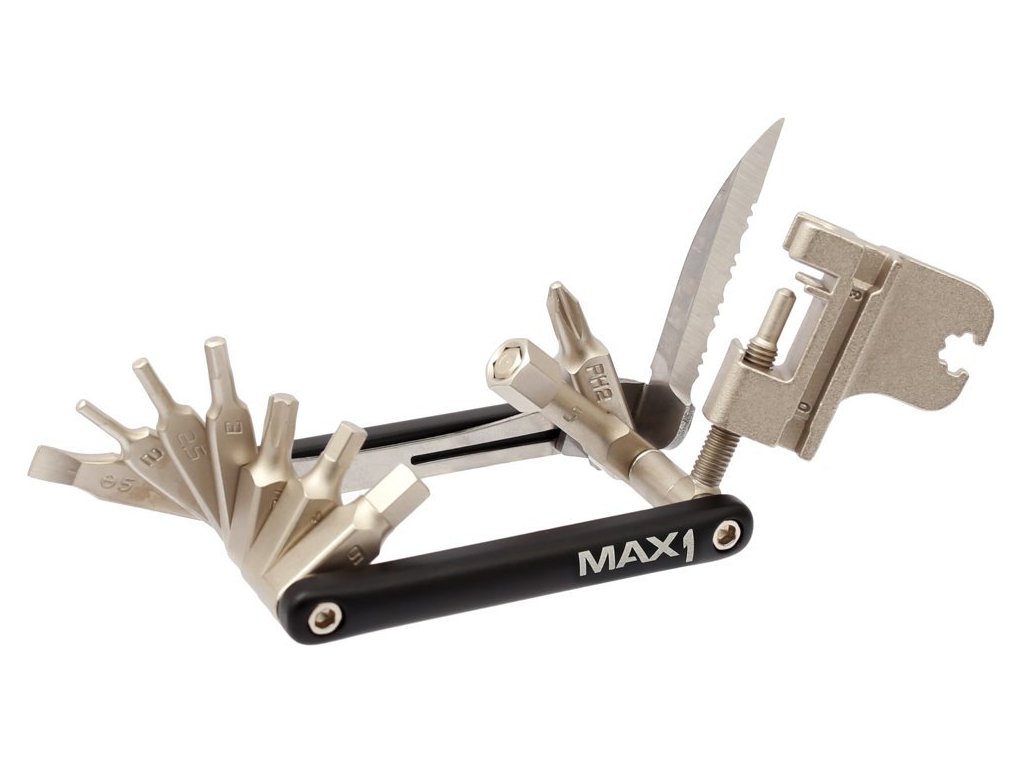 Multifunkční nářadí MAX1 17 je ideální společník na cesty nejen na jízdním kole. Multifunkční klíč obsahuje: - nýtovač řetězu - ostrý nůž s pojistkou - imbusy 2/2,5/3/4/5/6/8 - torx T25 - křížový PH2 a plochý šroubovák délky 5 mm - centrklíče 4hran (12/14/15/16G) i mavic T30Doplňkové parametry