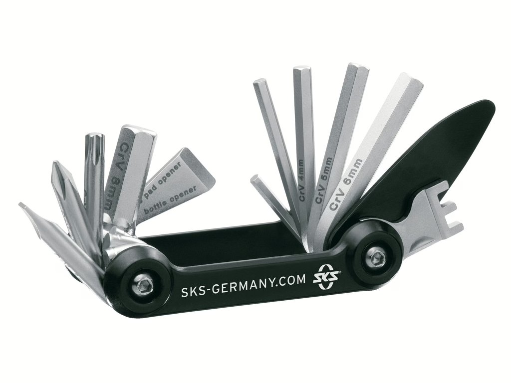 SKS TOM 14 je lehký a kompaktní mlutiklíč s 14 funkcemi, ideální pro údržbu kola na cestách. Obsahuje imbusové klíče (2,5 / 3 / 4 / 5 / 6 / 8 mm), křížový a plochý šroubovák, TORX T25, montážní páku, centrklíč G14/G15 a otvírák lahví. Dodává se s praktickým obalem s logem SKS pro snadné přenášení a ochranu.