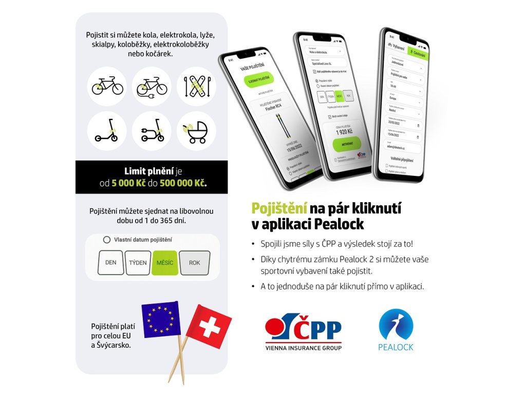 S chytrým zámkem Pealock a pojištěním proti odcizení od ČPP se už nemusíte obávat nechat Vaše kolo, elektrokolo, koloběžku, lyže (skialpy) nebo kočárek bez dozoru. A to kdekoliv v rámci Evropské unie a ve Švýcarsku.