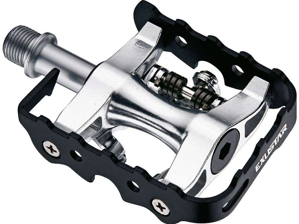 Exustar E-PM812 jsou univerzální trekingové pedály se třemi typy nášlapů. Z jedné strany je SPD zámek pro cyklistické tretry, z druhé strany platforma pro běžnou sportovní obuv, ke které lze přidat klipsny nebo řemínky pro větší efektivitu jízdy. Tělo pedálu je z eloxovaného hliníku, CrMo osy a dvojitého ložiskového systému (kuličková ložiska). Jednostranné kufry jsou typu EPS-M (kompatibilní s Shimano MTB).