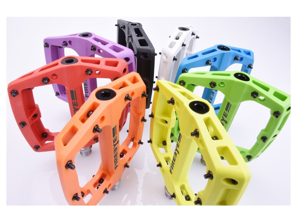 Lehoučké plastové pedály s nízkým profilem a velkou plochou od značky FIREEYE. Pedály jsou posazeny na zapouzdřeném průmyslovém ložisku. Průmyslová ložiska jsou zárukou hladkého chodu a dlouhé životnosti. Samotné tělo pedálu je vyrobeno z odolného Nylonu a osa z ocely. Každá strana pedály nabízí celkem 10 vyměnitelných a dostatečně vysokých pinů. Pedály jsou vhodné pro Downhill, Freeride, Enduro, Trail i Dirt Jumpy.