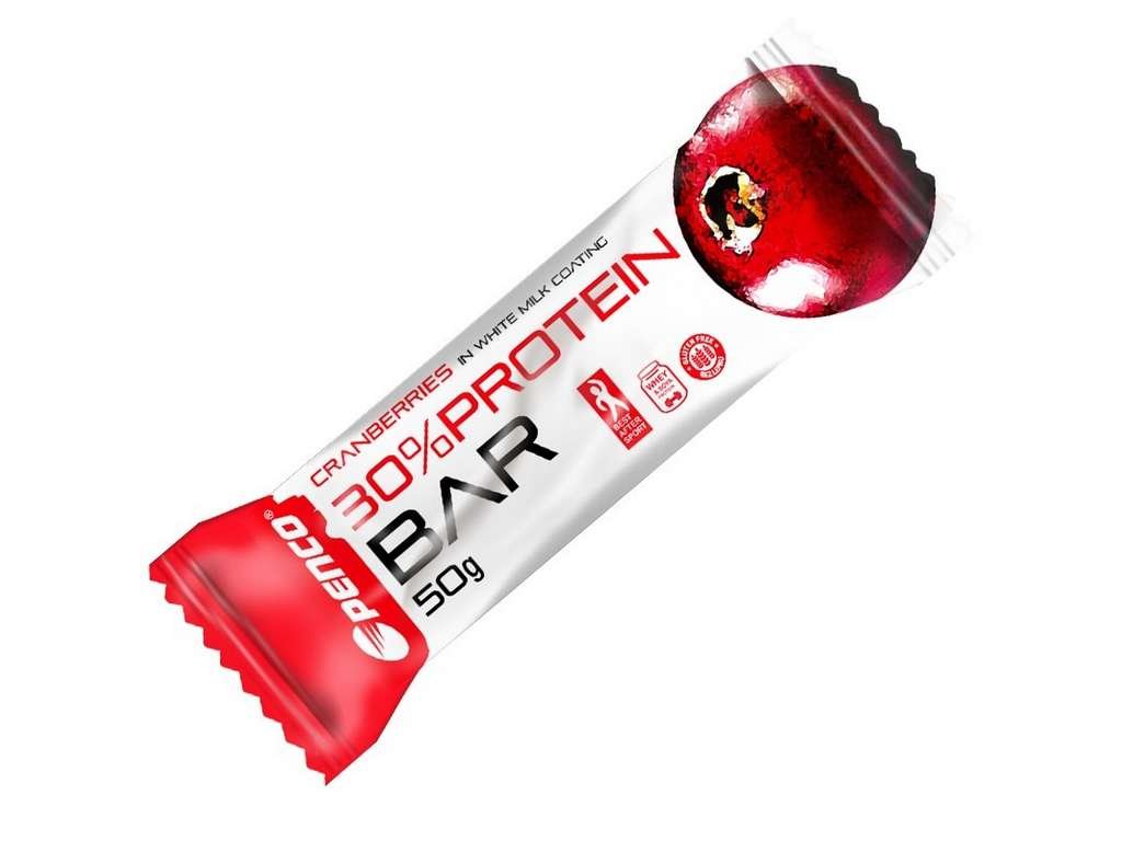 Penco® PROTEIN BAR Brusinka je vynikající proteinová tyčinka v bílé polevě. Poskytuje 30% kvalitních proteinů, které podporují růst a udržení svalové hmoty. Zdrojem proteinů je sojový izolát a syrovátkový proteinový koncentrát (WPC), obsahující vysoký podíl biologicky aktivní frakcí, získaných unikátním šetrným procesem Cross-Flow mikrofiltrace (CFM).