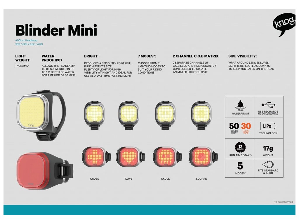 Vyznačuje se řadou vzorů, díky nimž je tento zadní Blinder Mini jedním z nejindividuálnějších světel Knog vůbec, zejména pro jeho malou, ale zato mohutnou velikost. Je k dispozici jak v přední tak v zadní variantě pro vytvoření jedinečného páru.