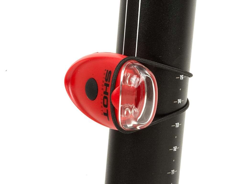 Zadní světlo - blikačka, 2 červené LED diody s vysokou svítivostí, přepínání mezi režimem blikání a konstantním svícením, univerzální a jednoduché uchycení elastickým řemínkem umožňuje uchycení na všechny průměry a tvary sedlovek, ekonomický provoz, 2xCR2032 baterie (jsou přiloženy), (50h blikání a 20h svícení).